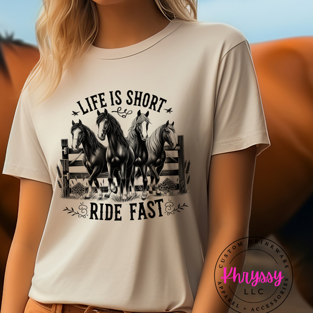 Live in the moment with our Life is Short Ride Fast Unisex Shirt. This playful and quirky design will add a touch of humor to your wardrobe. Don't take life too seriously and enjoy the ride! At Khryssy, we take pride in offering our ultra-soft, unisex apparel that feels like a dream against your skin. Experience the brilliance: Our images are expertly applied with cutting-edge DTF technology! MATERIAL & SIZING Cutting-edge DTF and heat transfer imaging technology Unisex Fit Manufacturers allow for a tolerance of + or - 1 inch for sizing FIT Experience the ultimate comfort of our apparel, designed to fit like your most cherished favorite. Our sizes are true size. If you desire a more fitted look, simply order down a size and discover a flattering silhouette that accentuates your style. WASH AND CARE To ensure its long-lasting brilliance, we kindly advise you to machine wash it in cold water with similar colors (remember, no bleach!). Afterward, simply hang or delicately lay your cherished piece flat to dry. Oh, and a little reminder - avoid ironing over any decorations that might adorn your garment, as they deserve to stay unblemished. Before making that final click, please take a moment to double-check your chosen size and color selections. SHIPPING & TURNAROUND TIMES: All apparel is made after the order has been placed. While we have a lot of blank materials on hand, there may be times in which I will need to order your size, color, or other item for your apparel request. The suppliers that we use are super fast (99.9% of the time) which means we can have what is needed by the very next day. If there are any delays to your request, I will contact you immediately. Standard shipping We estimate that it will take approximately 5-7 days for your shirt to be created and delivered to your doorstep. Looking for a color but don't see it? Please let us know, and we will work with you to get you the exact color you are looking for! Backorder shipping time will be communicated with the customer Please contact us with any questions at KhrystinaLDesigns@gmail.com THE KHRYSSY GUARANTEE:Before Khryssy products go out, each product is personally inspected thoroughly to ensure that it meets our high expectations of quality merchandise. If the product does not meet Khryssy standards, it is discarded and remade until it is approved. Please Note: Images shown on the listings are digitalized and shown as mockups. The actual look of the final product can slightly differ as we handcraft each one. Colors may appear slightly different on the final product from the color you see on your computer screen. CONTACT US:Have a question? Looking for a more customized product? Please message us here at khryssy.com or send us an email at KhrystinaLDesigns@gmail.com
