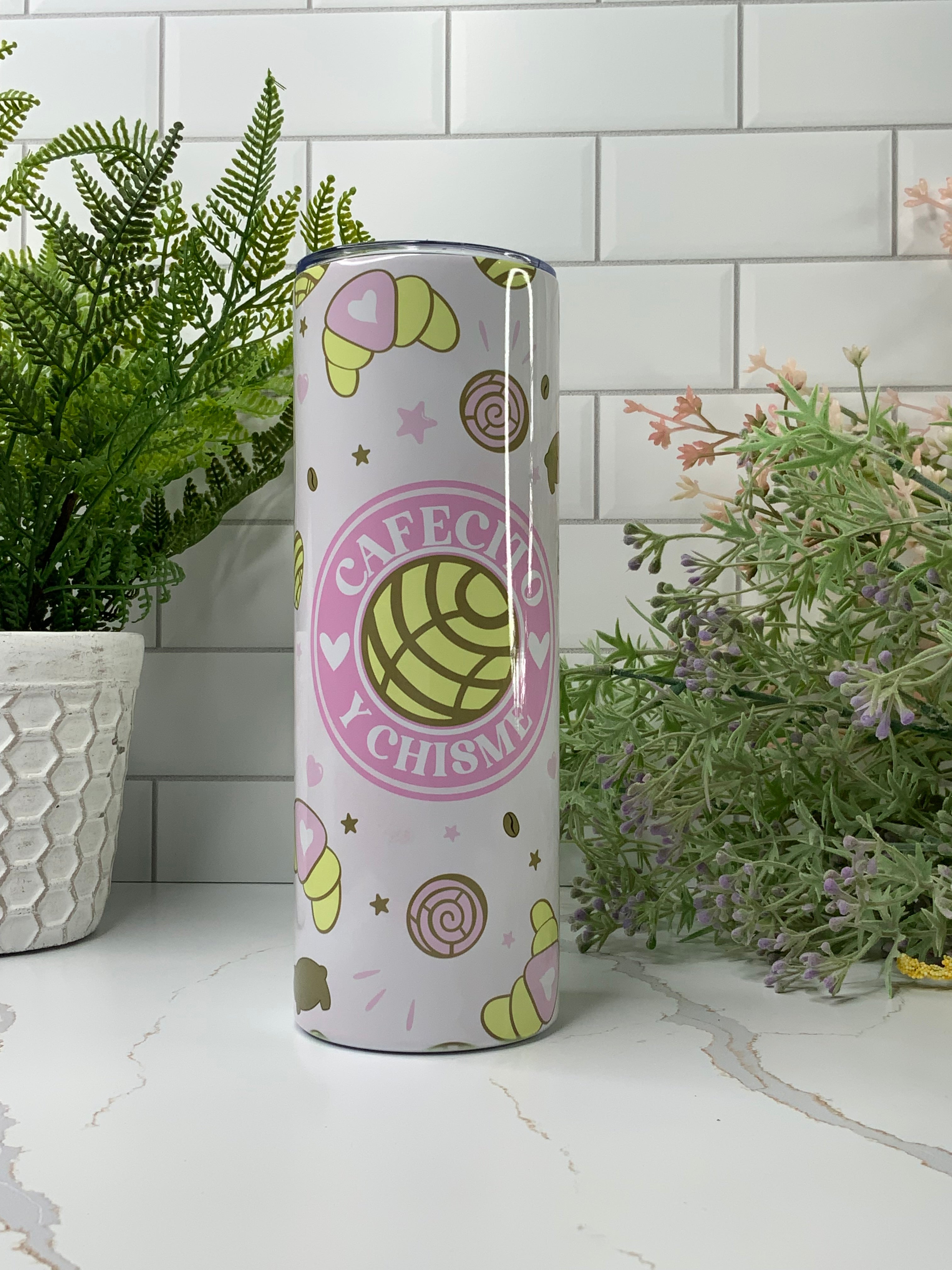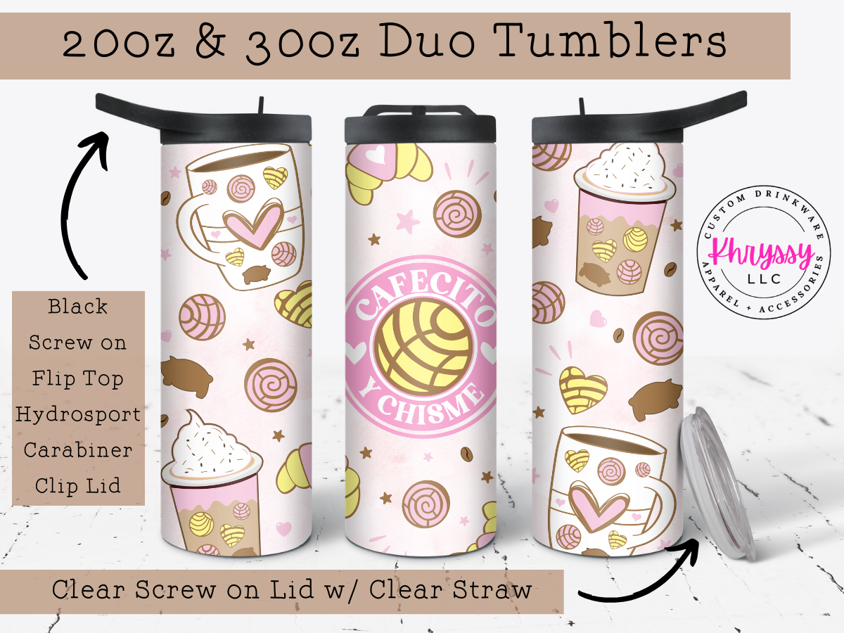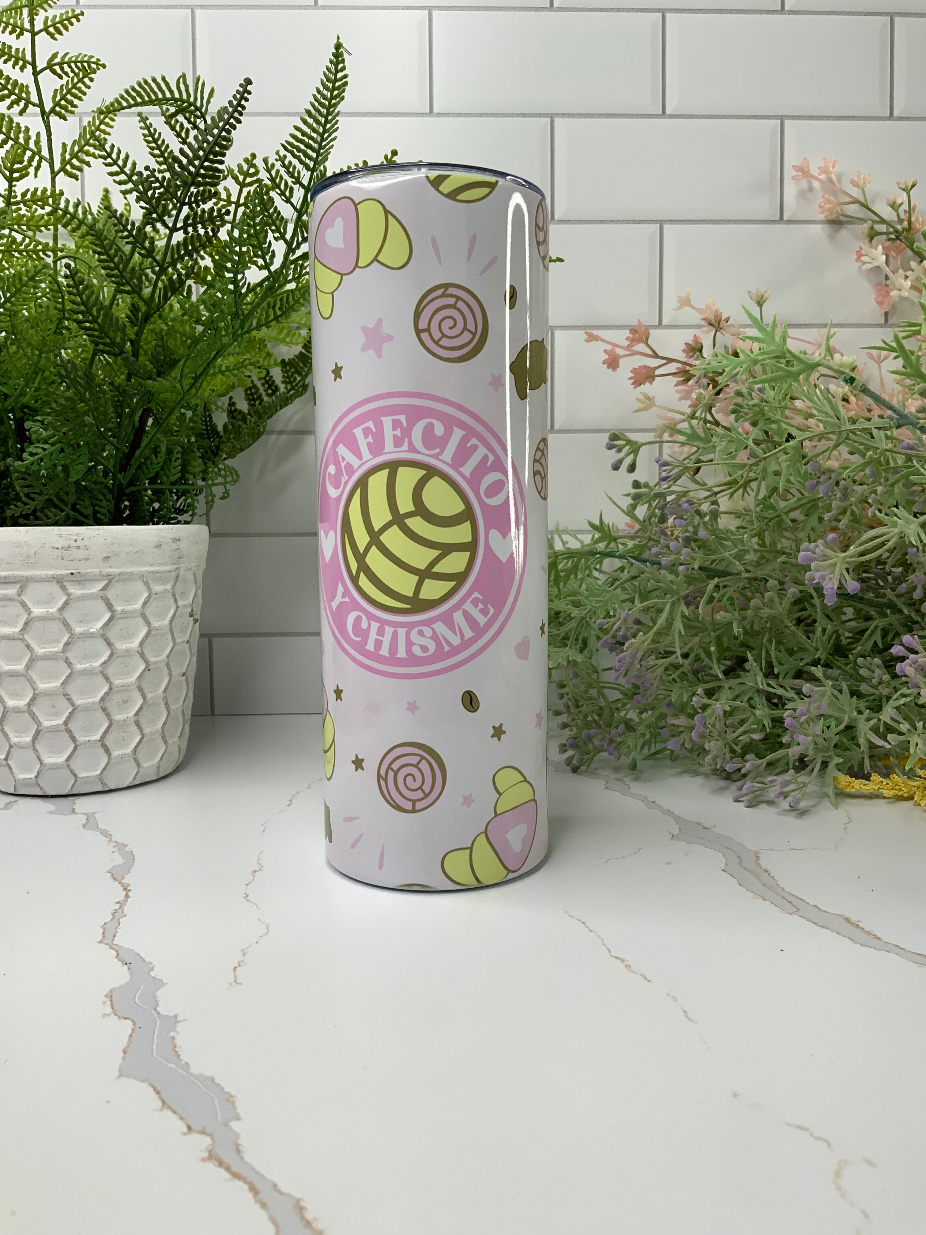Cafecito Y Chisme 20oz Tumbler with Straw, perfect for holding your favorite beverage! This tumbler is perfect for any coffee lover!