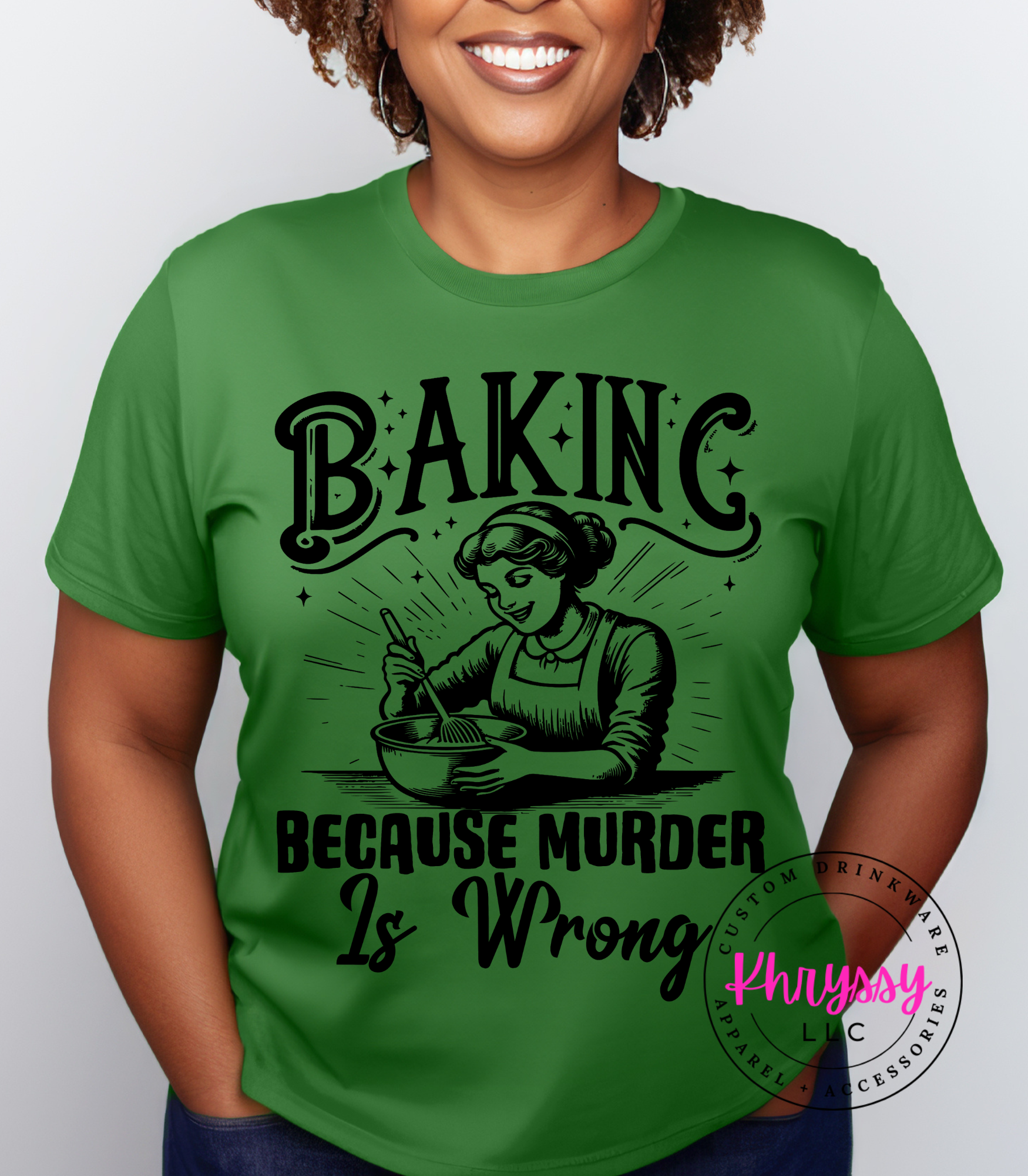 Embrace your love for baking and witty humor with our "Baking Because Murder is Wrong" unisex shirt. This shirt is perfect for those who find solace and joy in the art of baking, declaring their dedication to creating delicious treats rather than resorting to extreme measures.