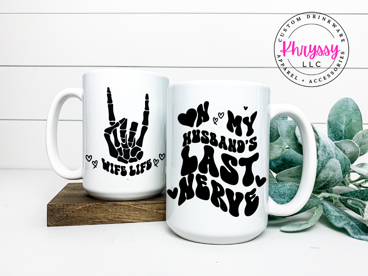 Introducing our On My Husband's Last Nerve 15oz Coffee Mug, the perfect gift for wives who appreciate a little humor and want to add some laughter to their mornings. This hilarious mug is designed to bring a smile to your face while enjoying your favorite hot beverage.