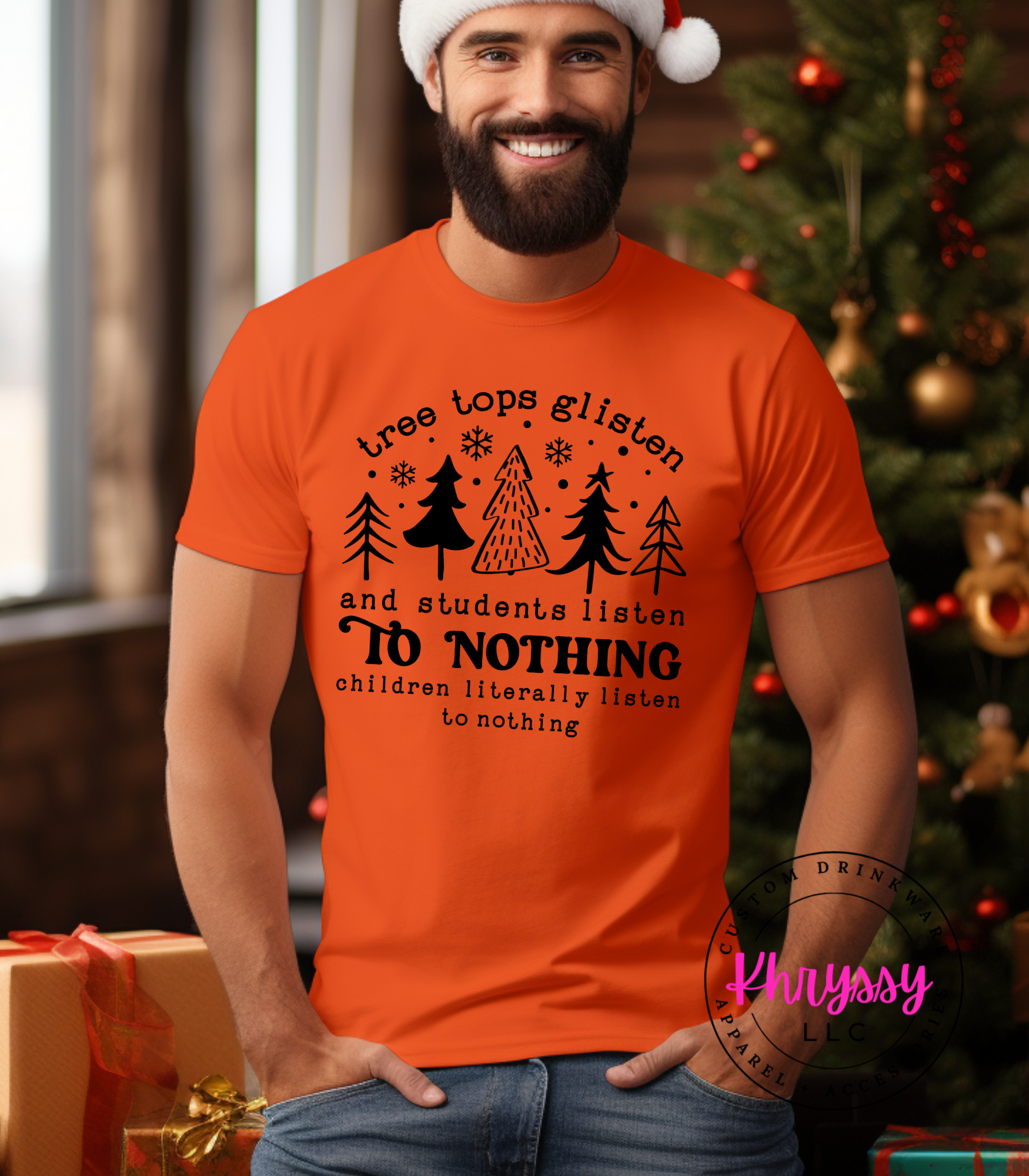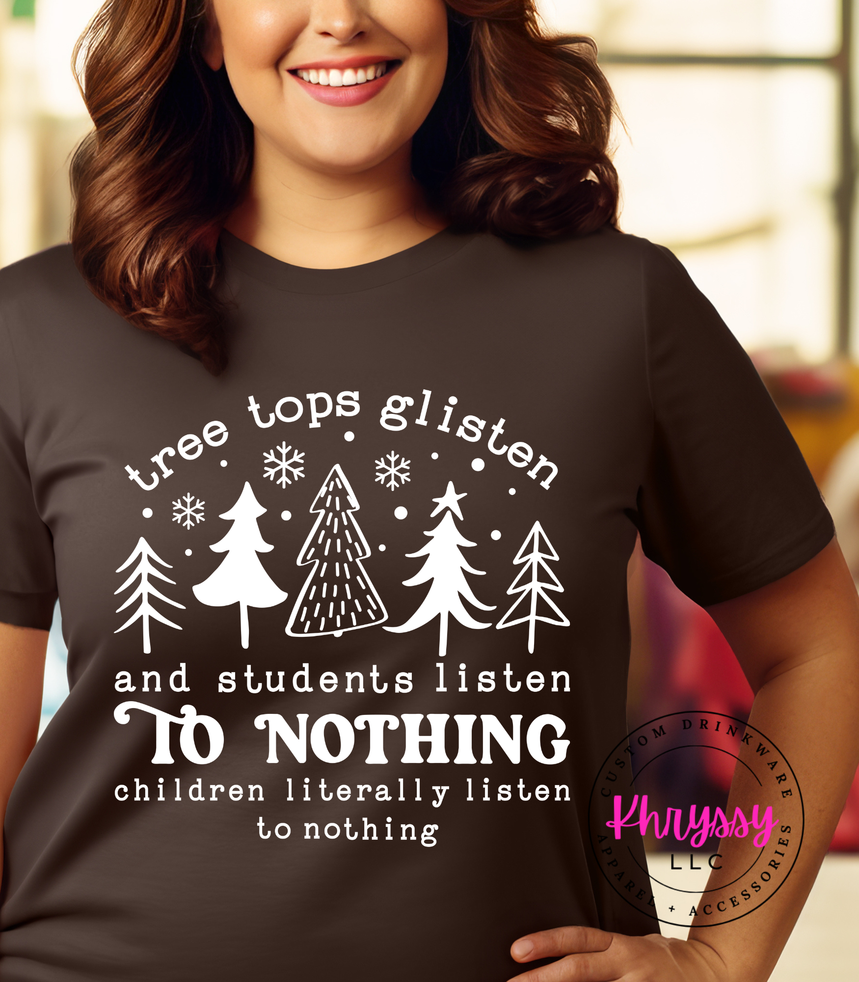 Embrace the holiday season with a twist of humor and nature-inspired charm wearing our "Tree Tops Glisten, Students Listen to Nothing" Unisex Christmas Shirt.