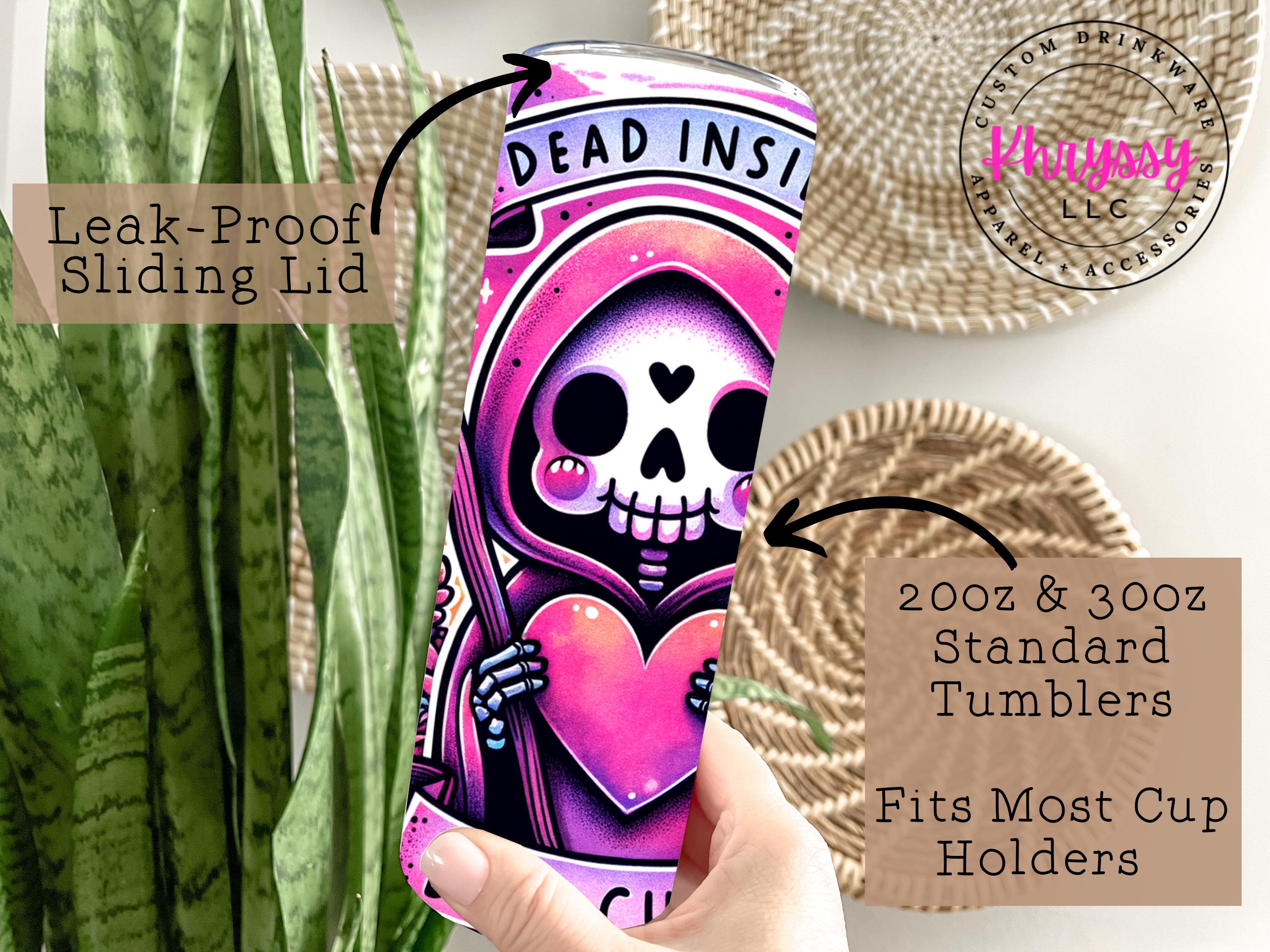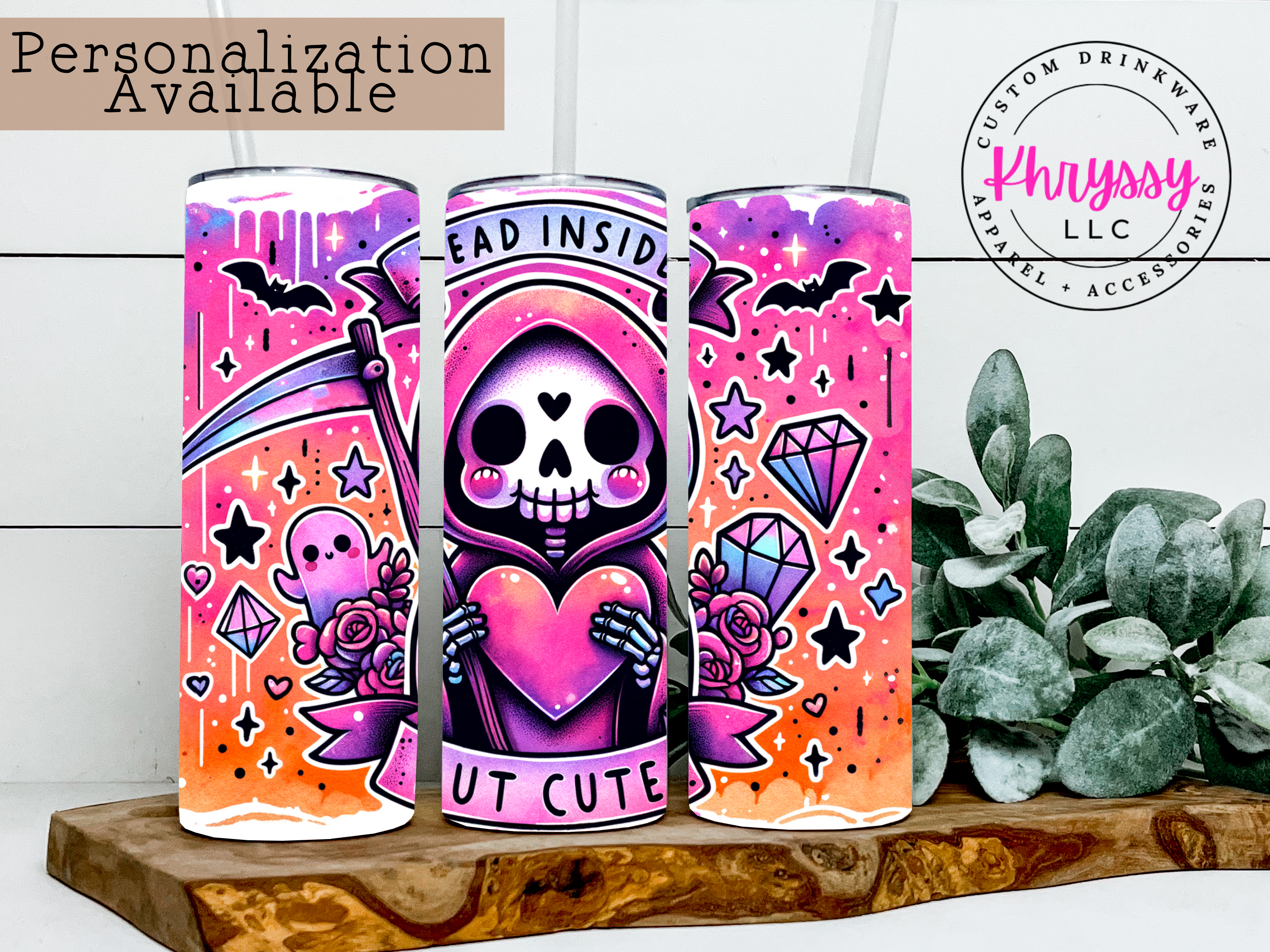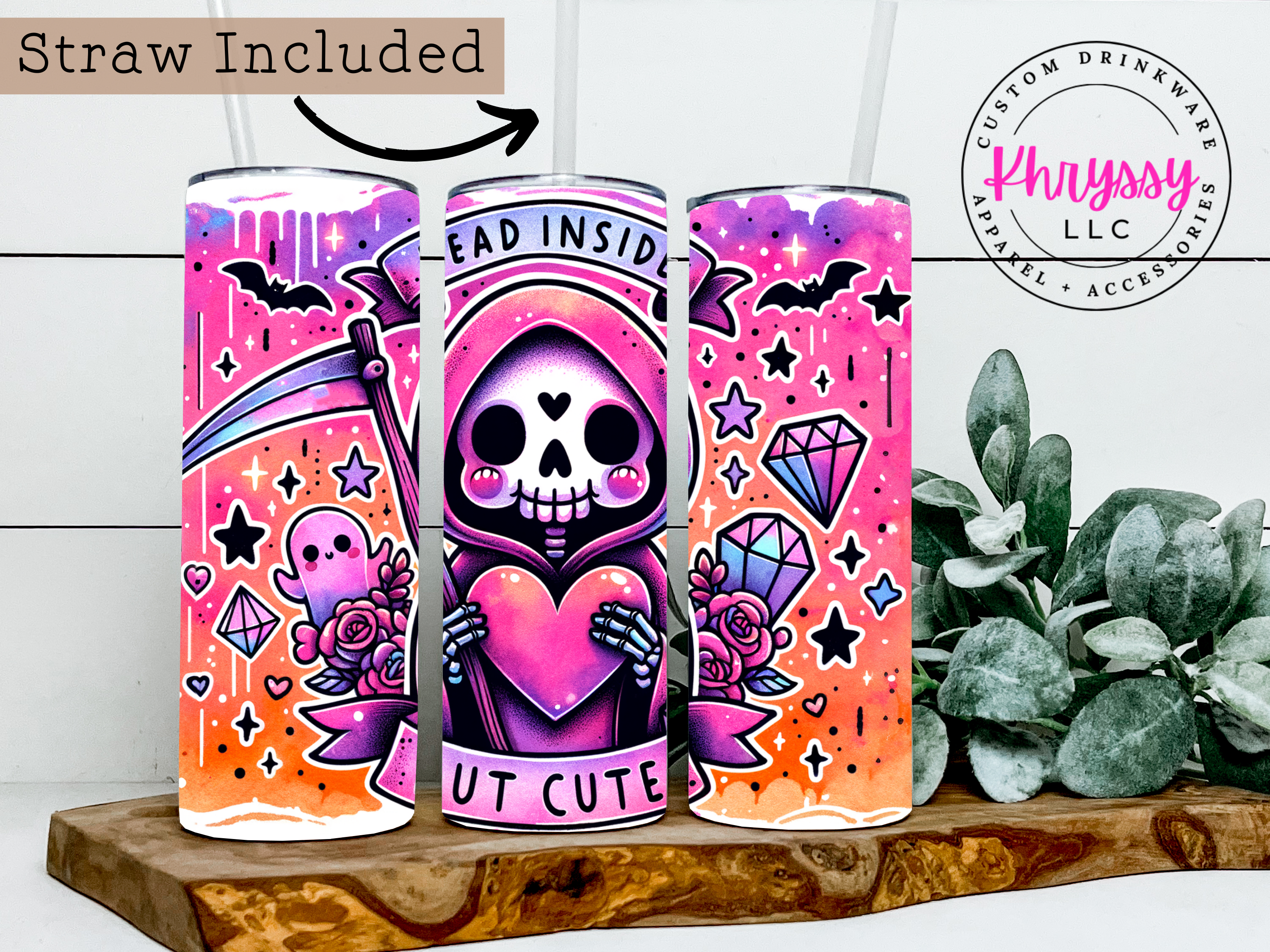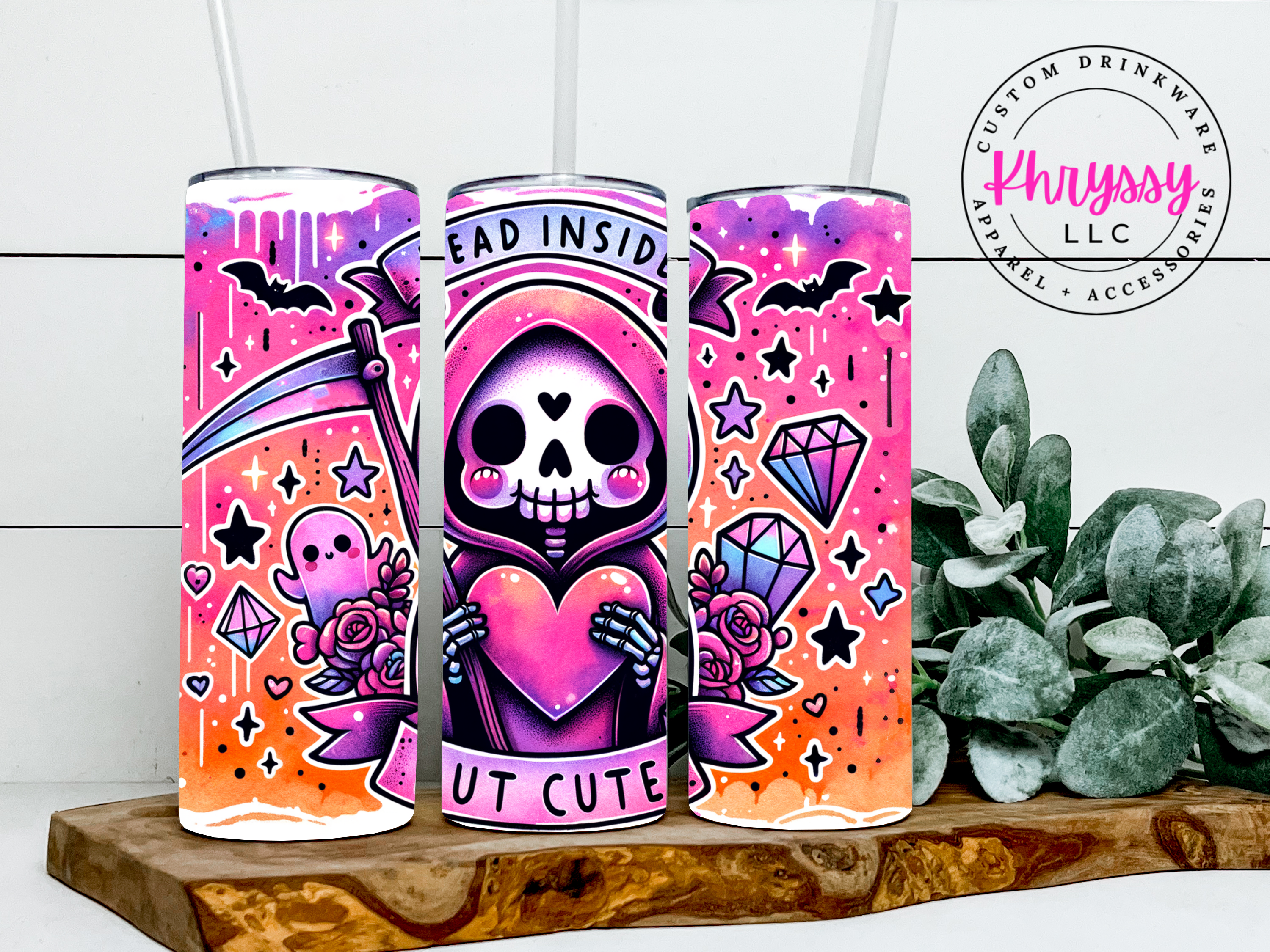Add a little spooky sweetness to your sip! Our Dead Inside But Cute 20oz Skinny Tumbler with Straw is the perfect combo of gothic edge and pastel charm. Featuring a grinning grim reaper clutching a heart, this tumbler is decked out in a vivid mix of purples, pinks, oranges with bats, gems, and ghostly friends floating in the background.