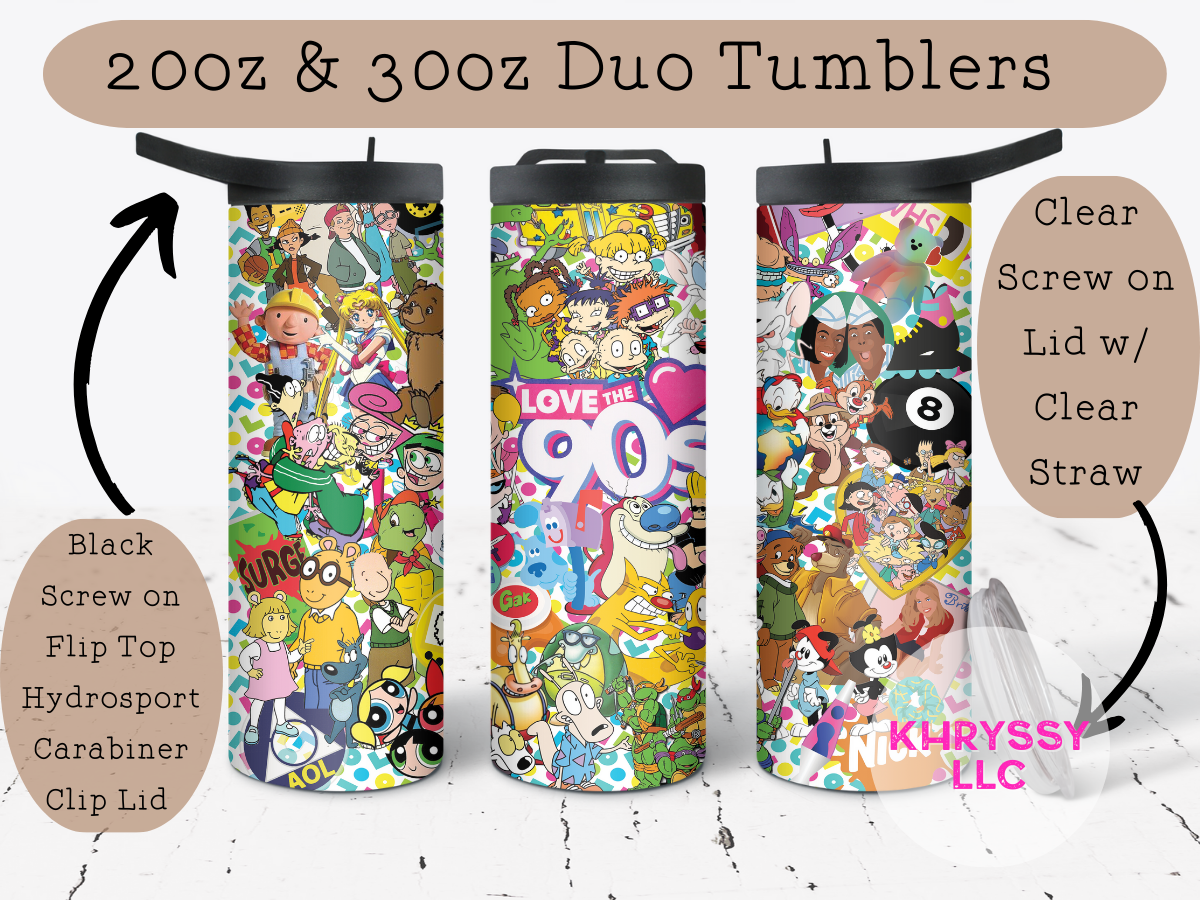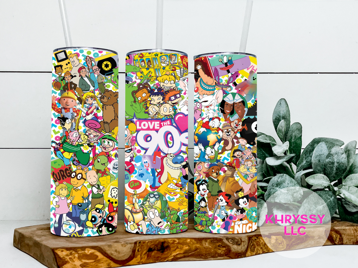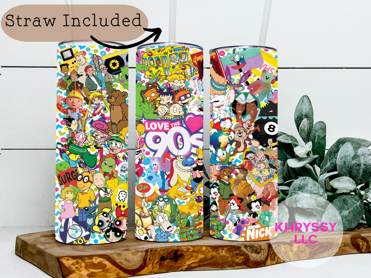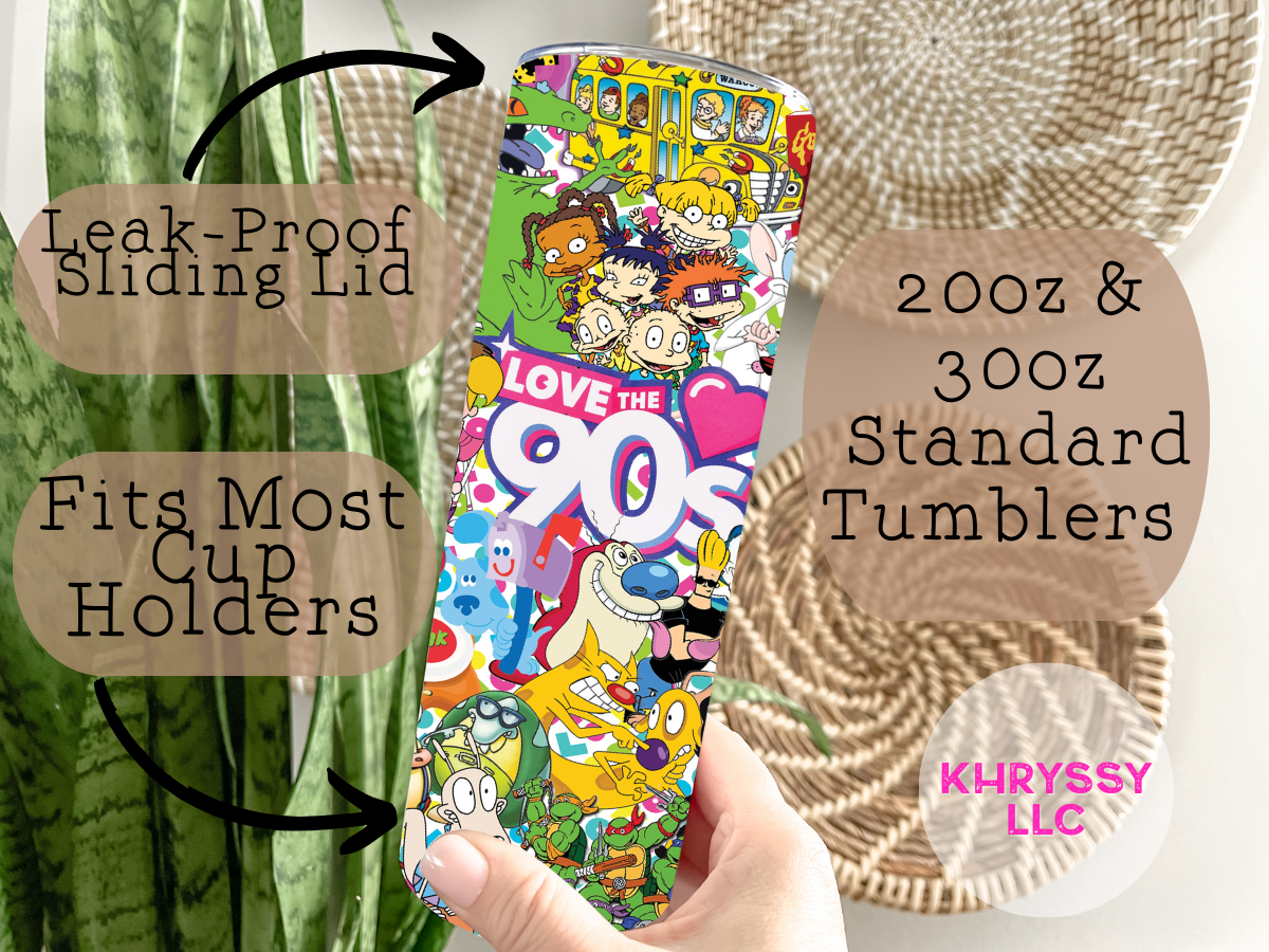 The highlight of this tumbler is its captivating design featuring all your favorite 90s cartoon characters. From Rugrats to SpongeBob SquarePants, from The Powerpuff Girls to Pokémon, this tumbler encompasses the magic of animation that defined our childhoods. Each glance at the tumbler will transport you back to a time of laughter and endless adventures.