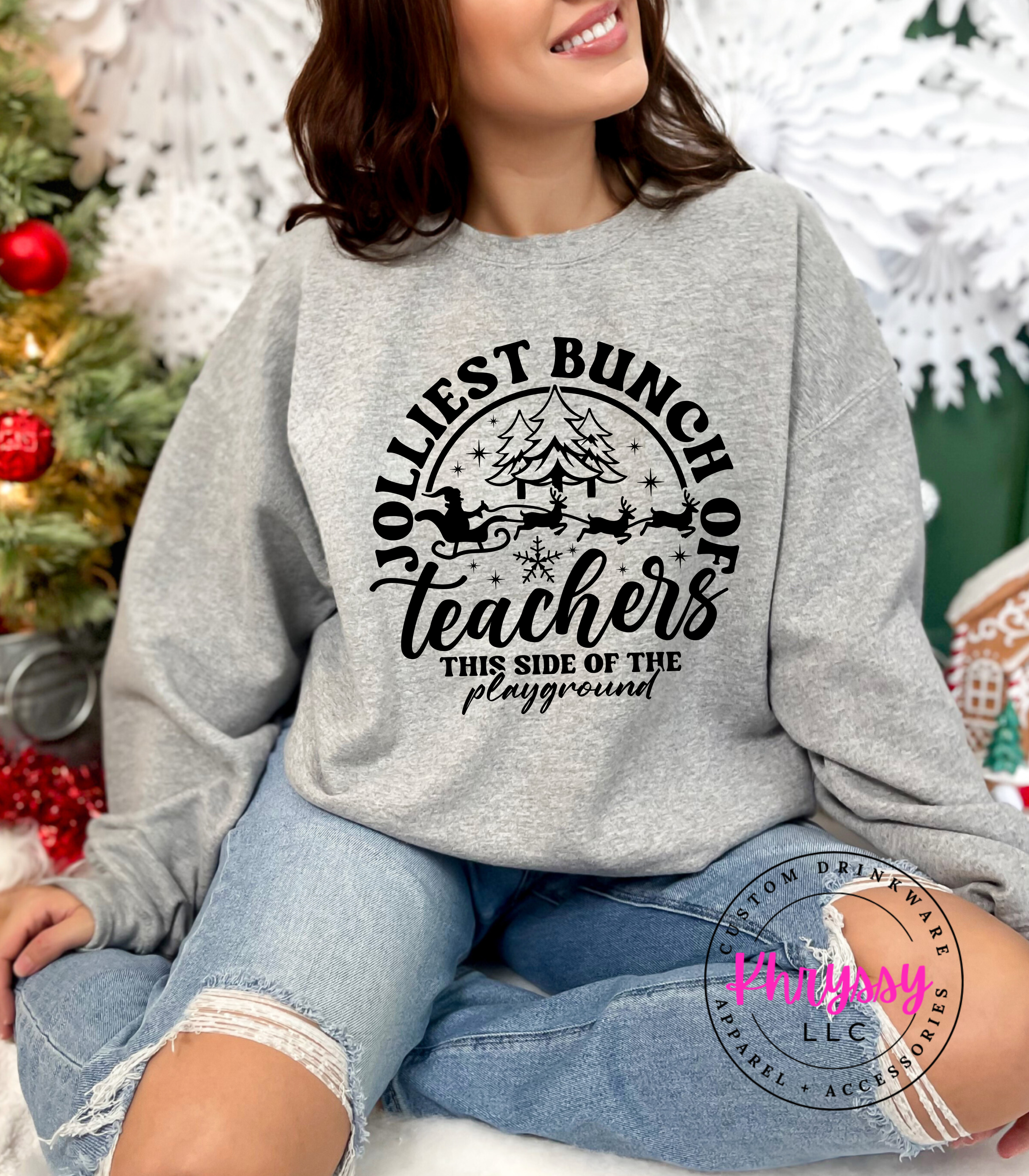 Show your appreciation for the special teachers in your life with this adorable "Jollest Bunch of Teachers This Side of the Playground" sweatshirt. Perfect for Teacher Appreciation Week, Christmas gift-giving, or just everyday wear to celebrate educators. Crafted from soft, cozy fabric, this shirt combines comfort with a fun, festive design featuring a whimsical Christmas theme with trees, reindeer, and holiday cheer. Whether you're a teacher or someone who loves teachers, this unique shirt is an ideal way to spread positivity and holiday spirit!