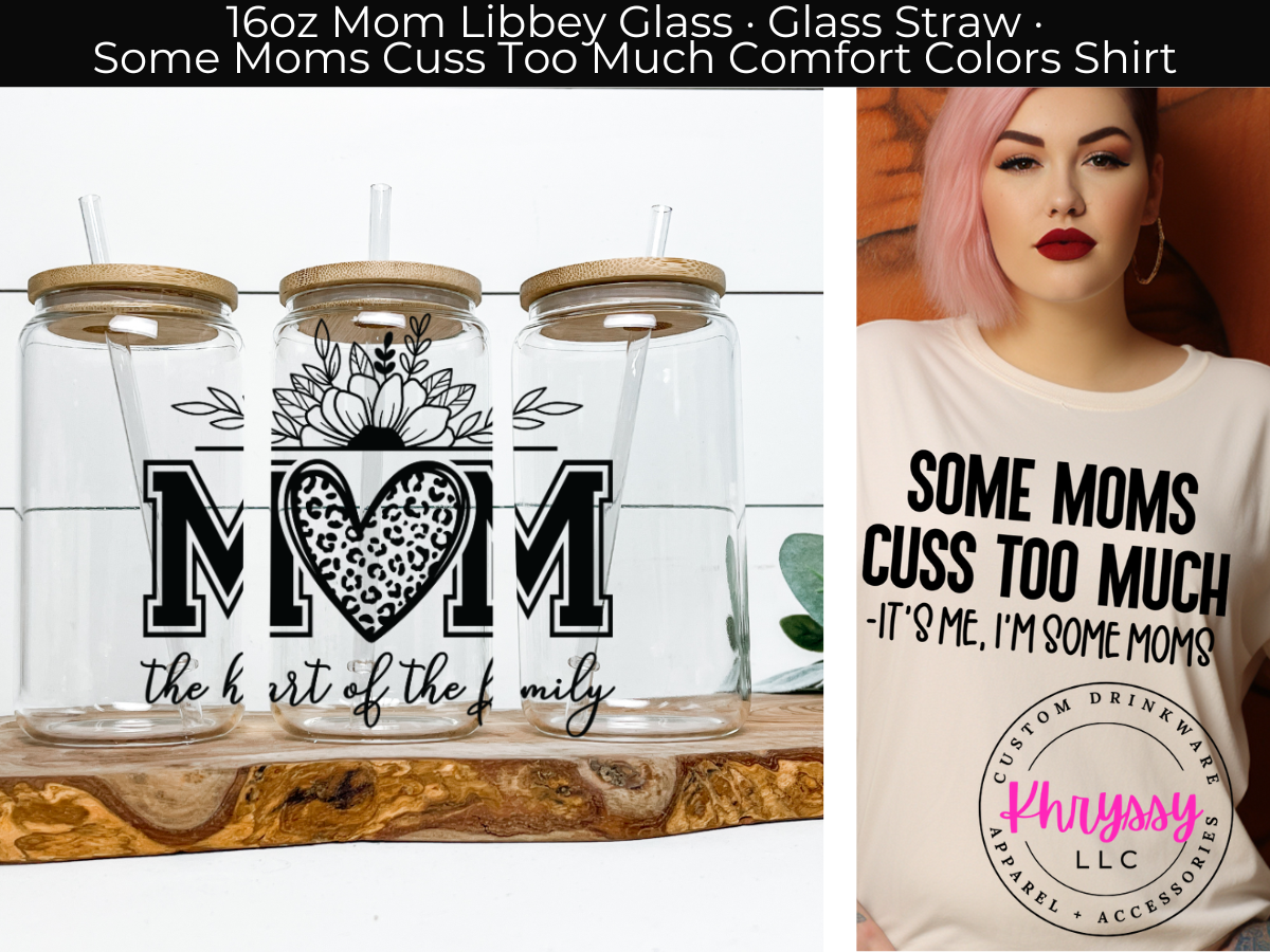 Accompanying this thoughtful glass cup is a cozy Comfort Colors shirt that reads "Some Moms Cuss A Lot. It's Me, I'm Some Moms." This playful and relatable message adds a touch of humor and authenticity, capturing the real and raw moments that make motherhood both challenging and rewarding.