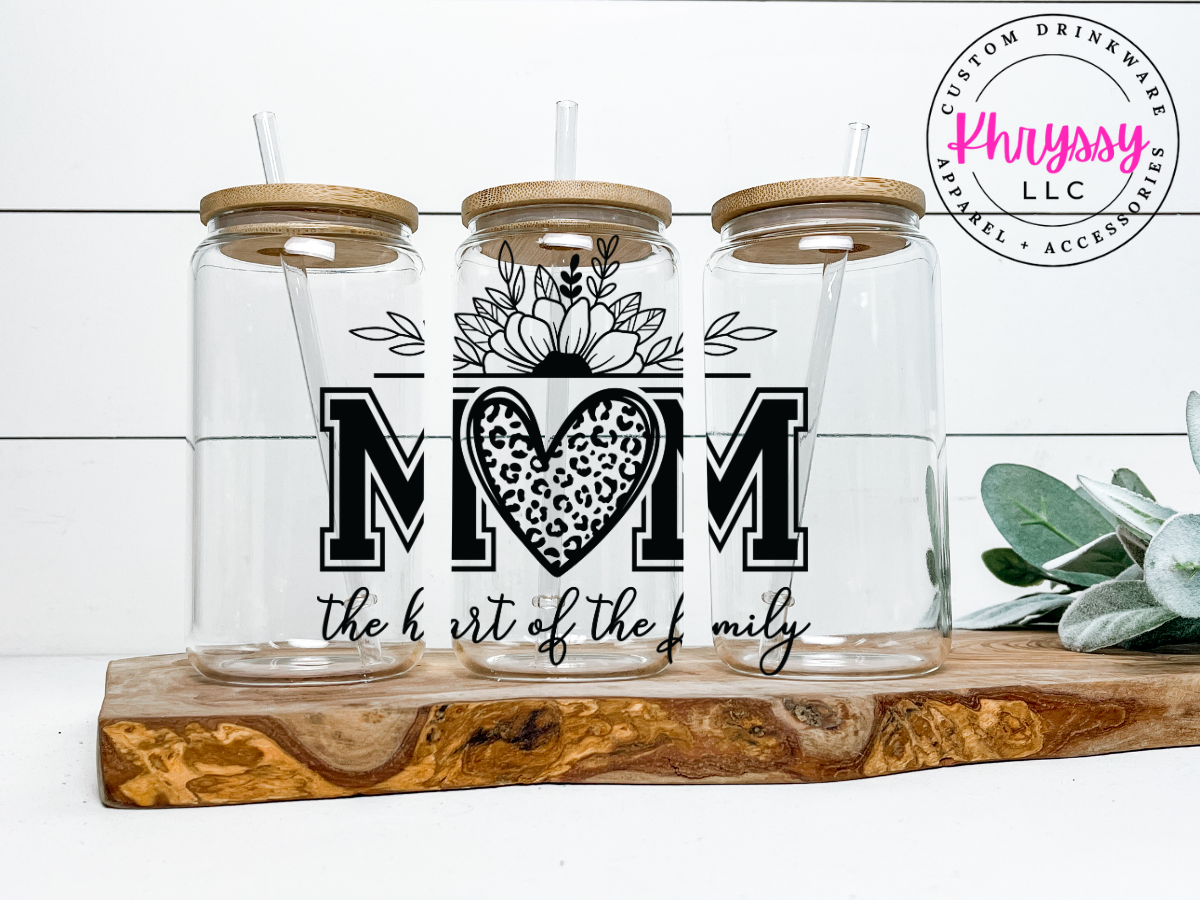 The 16oz Libbey glass cup is a symbol of comfort and warmth, just like a mother's embrace. Adorned with the endearing phrase "Mom: The Heart of the Family," this cup serves as a daily reminder of the central role that moms play in creating a loving and nurturing home.