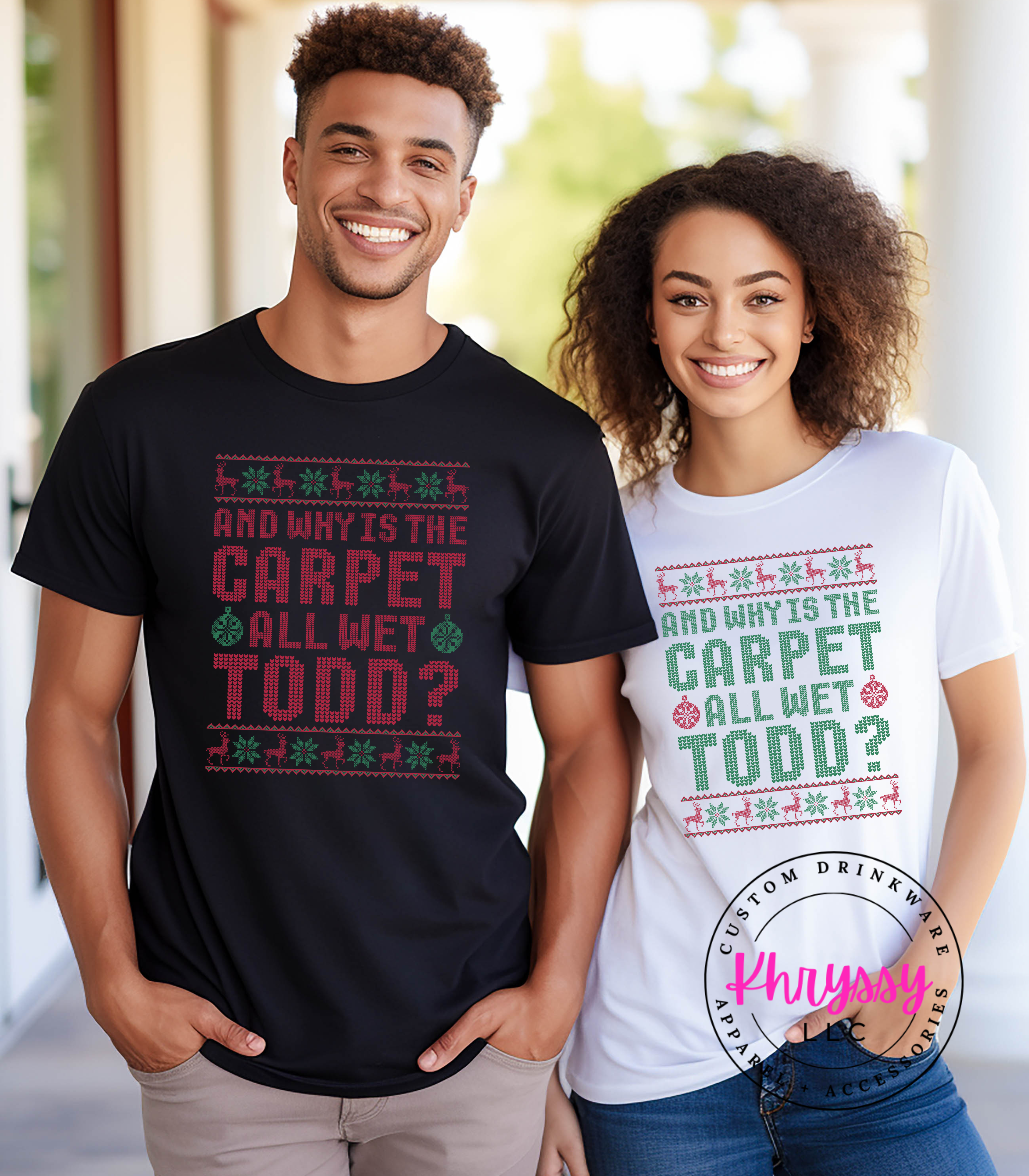 Bring a smile to everyone's face this holiday season with our "Why is the Carpet All Wet, Todd?" t-shirt, inspired by a classic Christmas movie. Perfect for fans of holiday humor, this tee is a great conversation starter at festive gatherings or casual outings. Made from high-quality, soft fabric, it ensures both comfort and style. Whether it's for yourself or a gift for a fellow movie buff, this shirt is a must-have for spreading Christmas cheer.